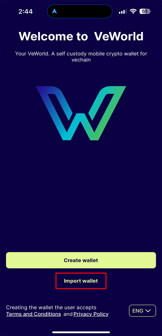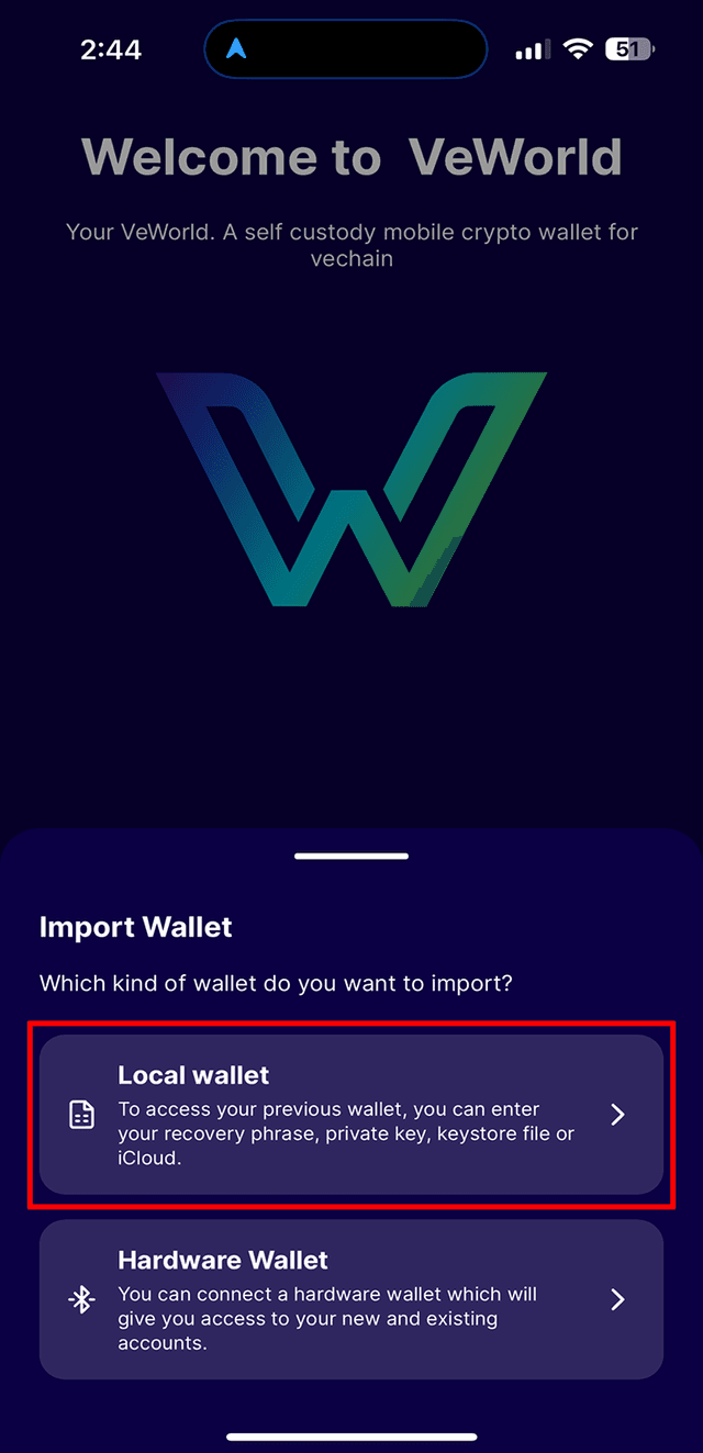 3. Open the 'VeWorld' app and select 'Import Wallet'→'Local Wallet'