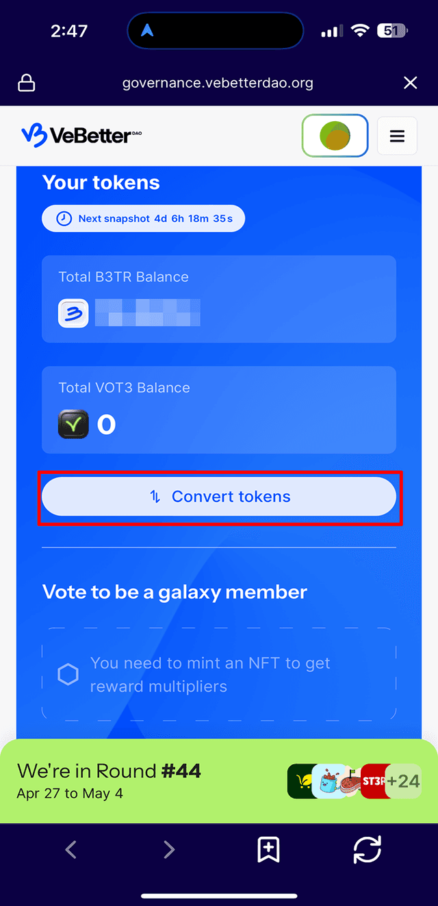 ・To be able to vote you need to swap your $B3TR tokens for $VOT3 tokens. Select the swap icon to do so