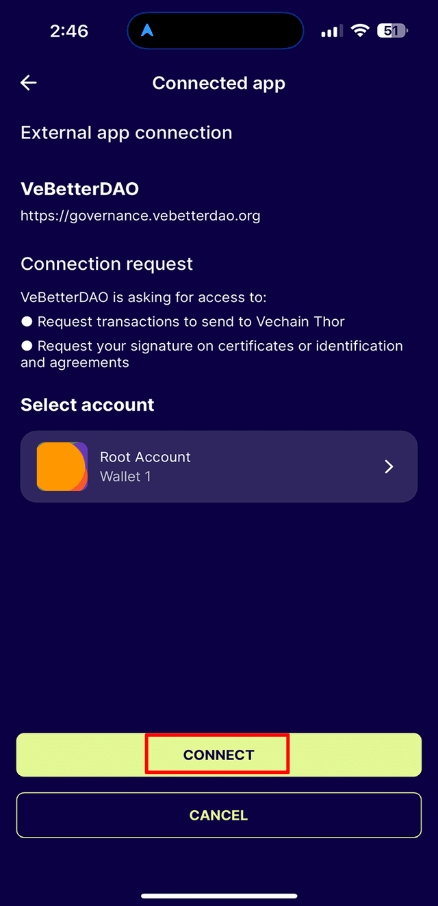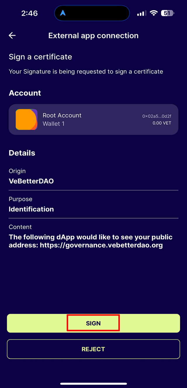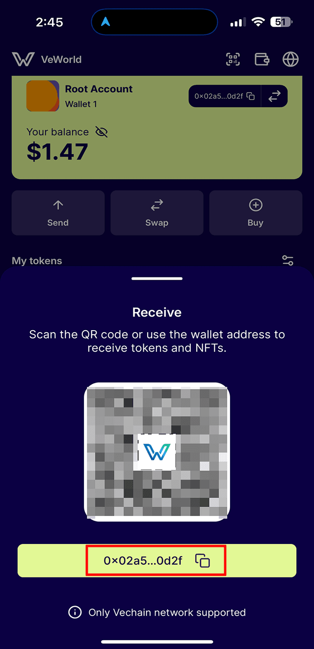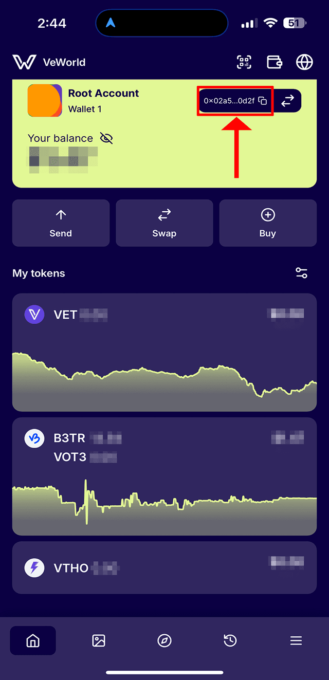 1. Open the VeWorld app and select the icon at the top with your wallet address