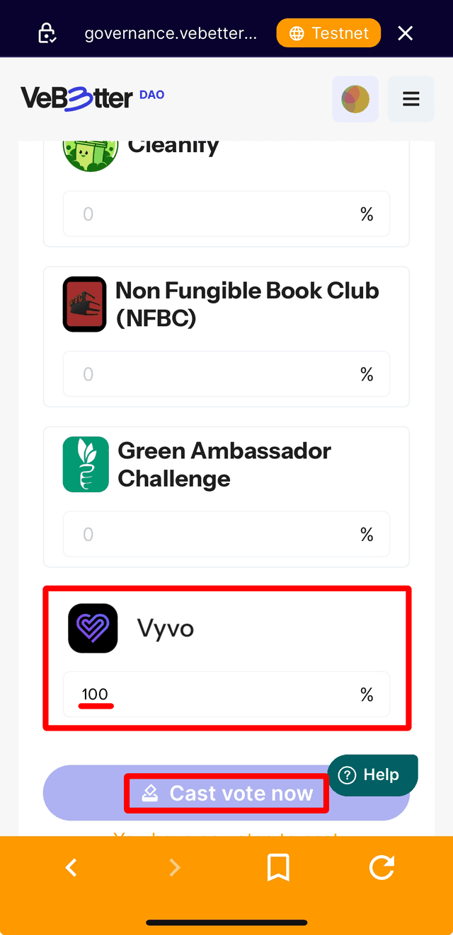 ・Scroll down until you see the different projects you can vote for at the bottom. Put in the percent of your $VOT3 tokens that you want to allocate to Vyvo Smart Chain and then select 'Cast Vote Now'