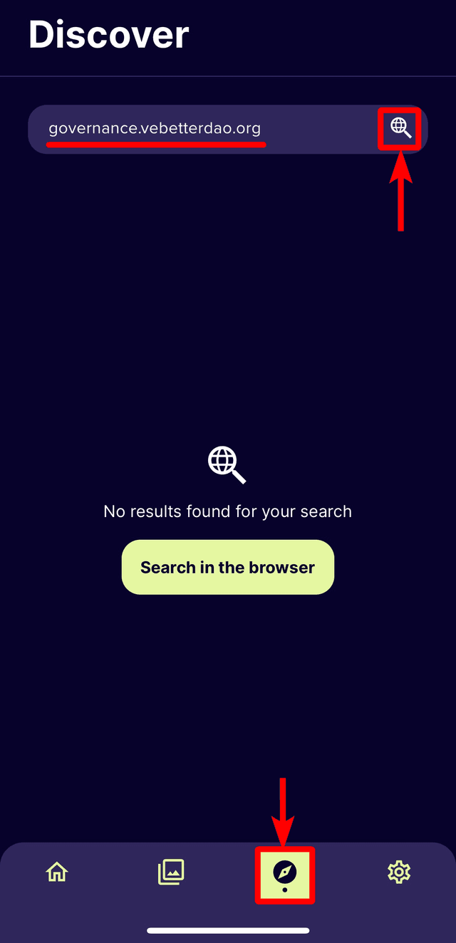 ・Open the VeWorld app and go to the 'Discover' Tab. Type in governance.vebetterdao.org in the address bar then tap the search icon