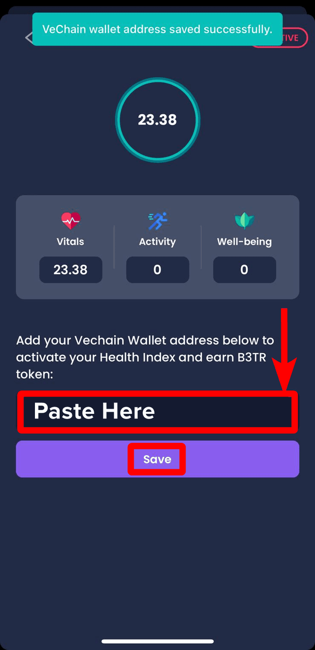 4. Select the Health Index, paste your VeWorld wallet address in the box, and select 'Save'